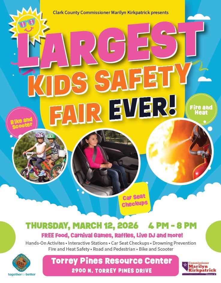 Clark County Commissioner Marilyn Kirkpatrick invites families from across the Las Vegas Valley to attend the Largest Kids Safety Fair Ever! on Thursday, March 12, 2026, from 4 p.m. to 8 p.m. at the Torrey Pines Resource Center, 2900 N. Torrey Pines Drive.