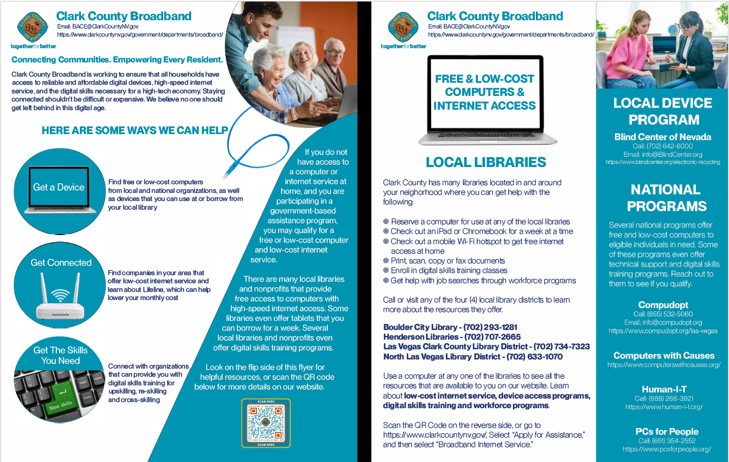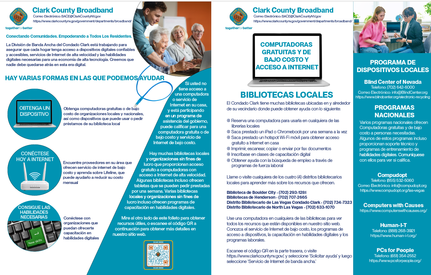 You can download the Clark County Broadband Flyer below in English and Spanish. These flyers contain links to our web pages and to local and national device programs, and contact information for the four (4) local library districts offering device access, digital skills training and workforce development programs.