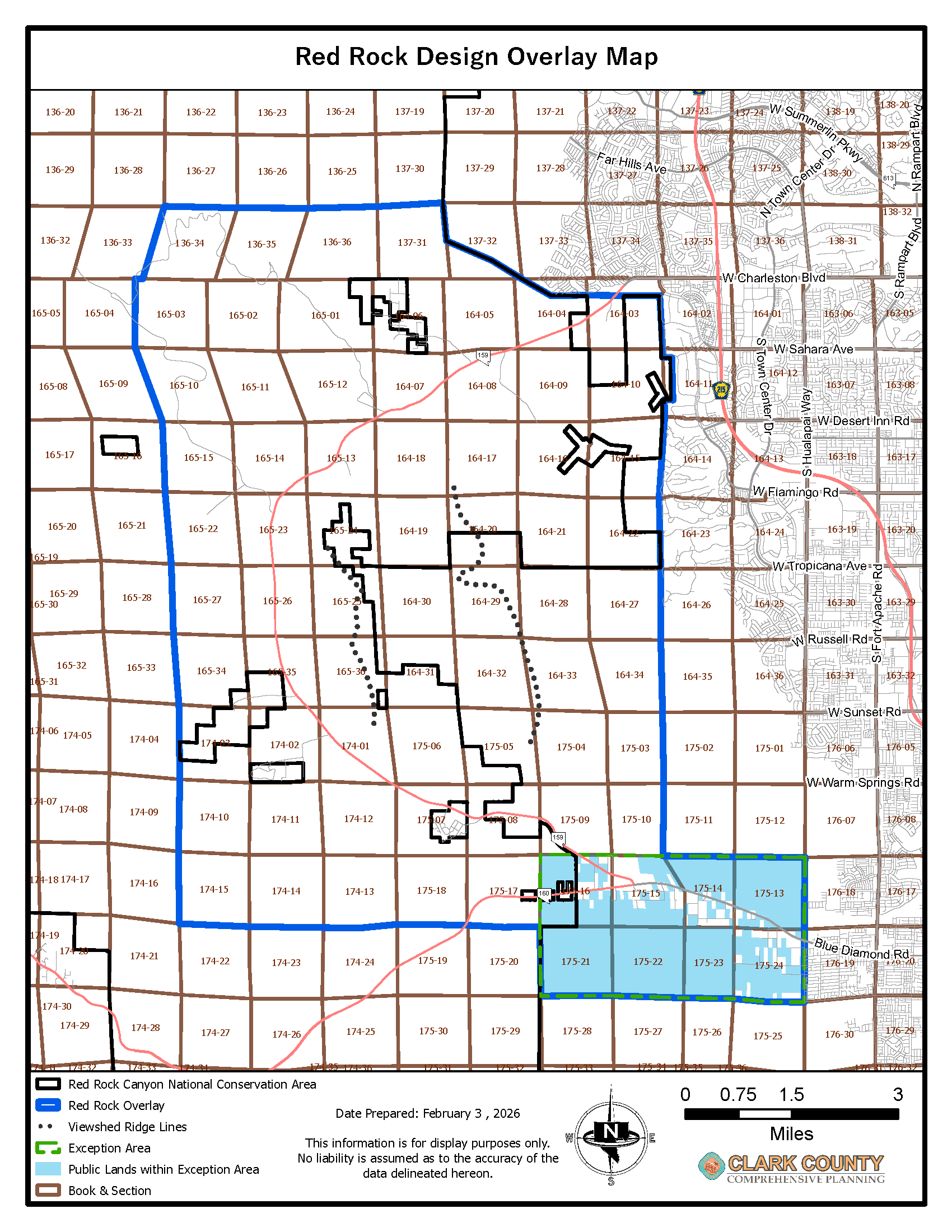 The Board of County Commissioners directed the Department of Comprehensive Planning to update the land use regulations and design standards for the Red Rock Overlay. The Red Rock Overlay is established to maintain the rural character of the area, preserve wildlife habitat, and minimize visual impacts of development on the adjacent Red Rock Canyon National Conservation Area. The Red Rock Overlay (RRO) Update is an opportunity to review, discuss, and comment on proposed modifications to the overlay requirements. The existing RRO can be found in Chapter 30.02.26.H of the Clark County Unified Development Code (Title 30) at the following link: Title 30. An excerpt of the existing overlay can also be viewed here.
