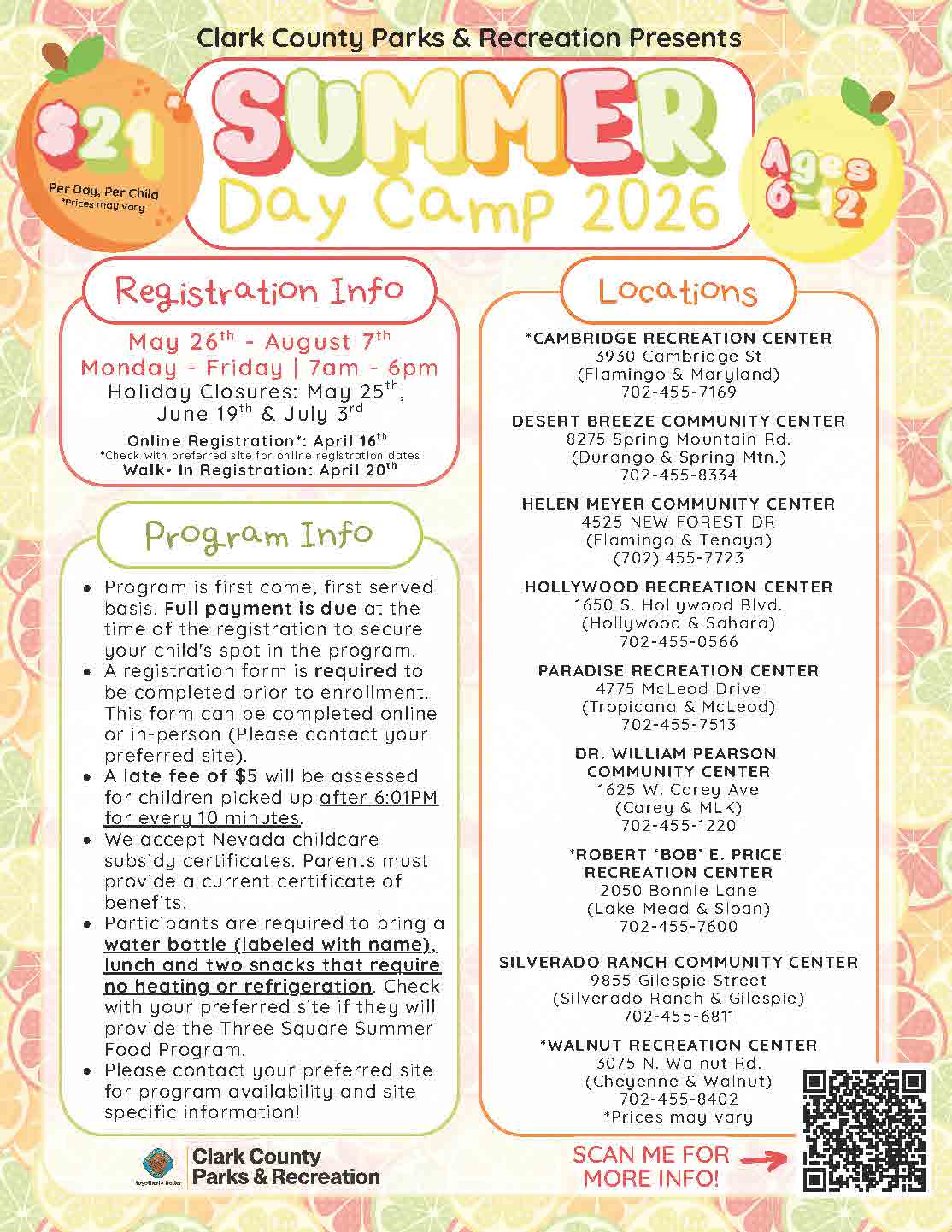 Registration Form - Online Registration - 2026 Summer Day Registration Camp Information - Walnut Recreation Center, 3075 North Walnut Road, Las Vegas, NV 89115