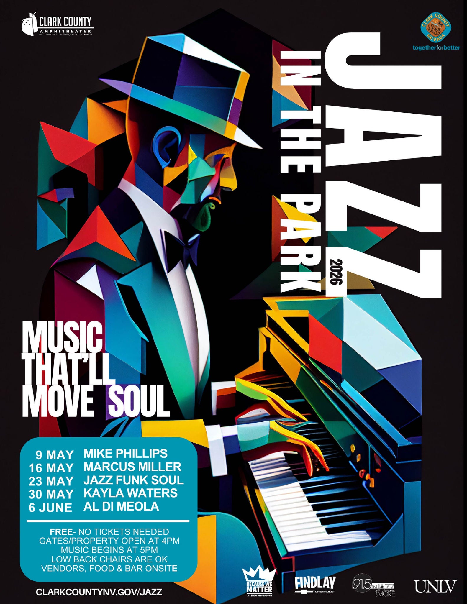 Jazz In the Park Series is produced by Clark County Parks & Recreation and Sponsored by Findlay Chevrolet, Fat Cat LV, 91.5 KUNV Jazz, UNLV and Because We Matter - Live Smoke & Vape Free.