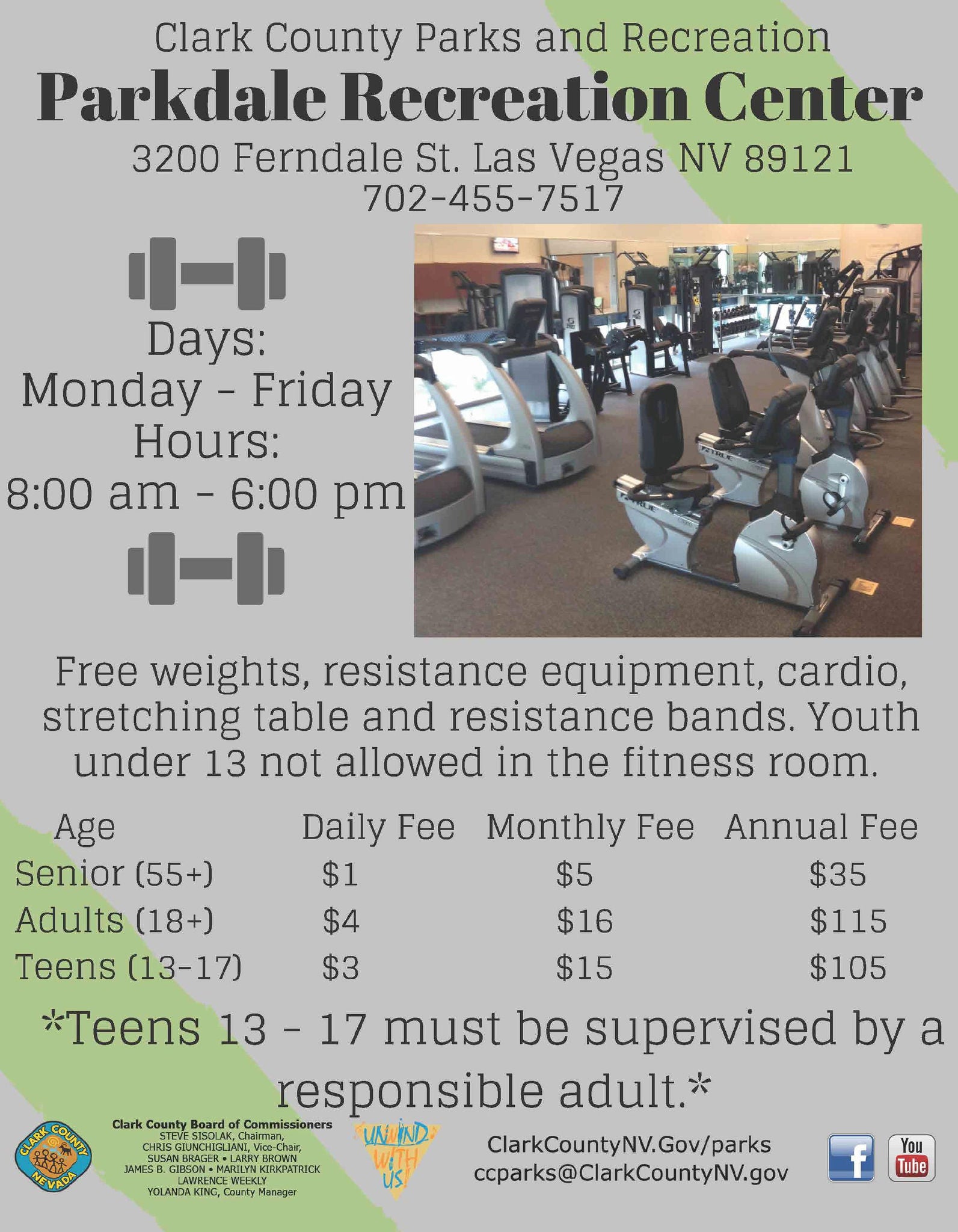 Parkdale Recreation and Senior Center's fitness center offers a variety of equipment at a reasonable price. Memberships may be purchased on a daily, monthly or yearly basis. Participants must complete a fitness waiver prior to working out. Equipment includes: free weights, resistance/strength equipment, stretching table, exercise/stability balls, resistance bands, treadmills, recumbent bikes, and elliptical machines. Youth under 13 years are not allowed in the fitness center. Youth 13-17 years must be supervised by a parent or responsible adult.