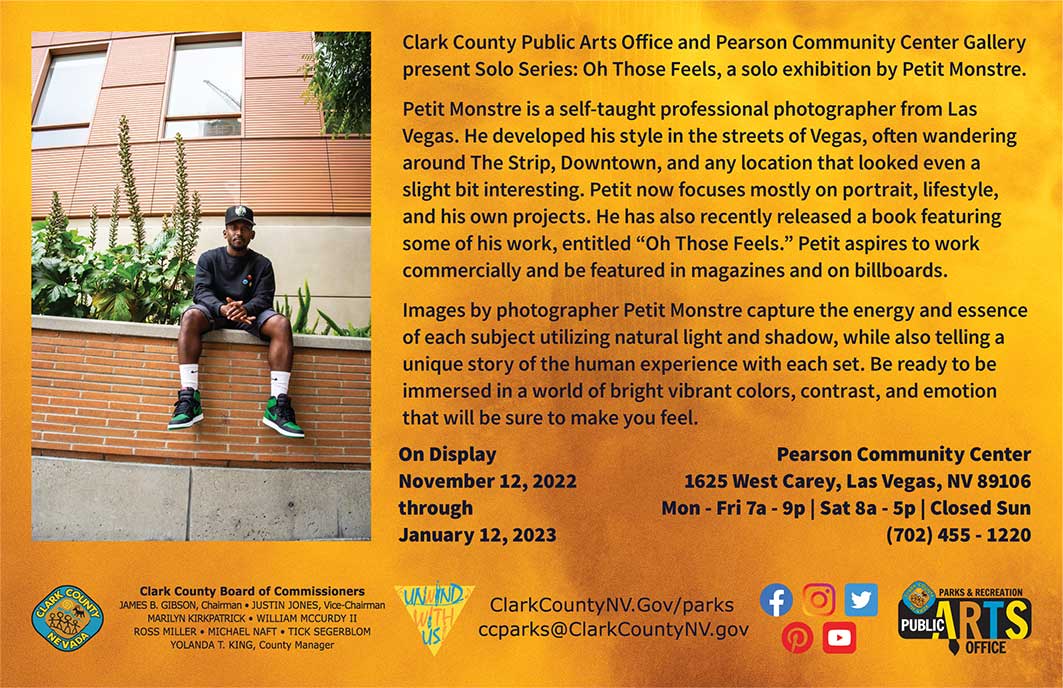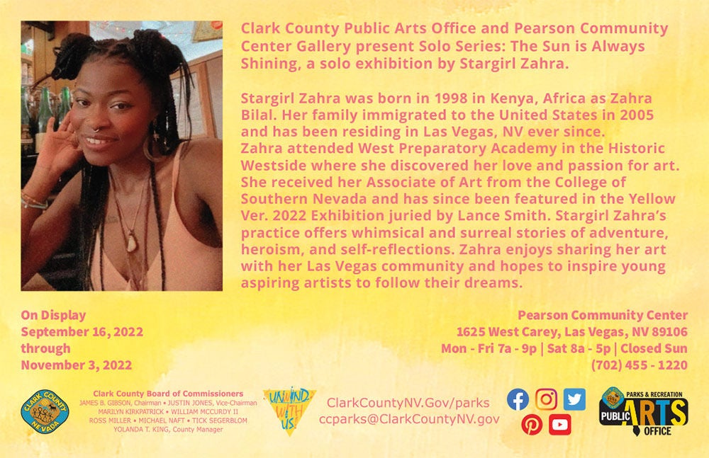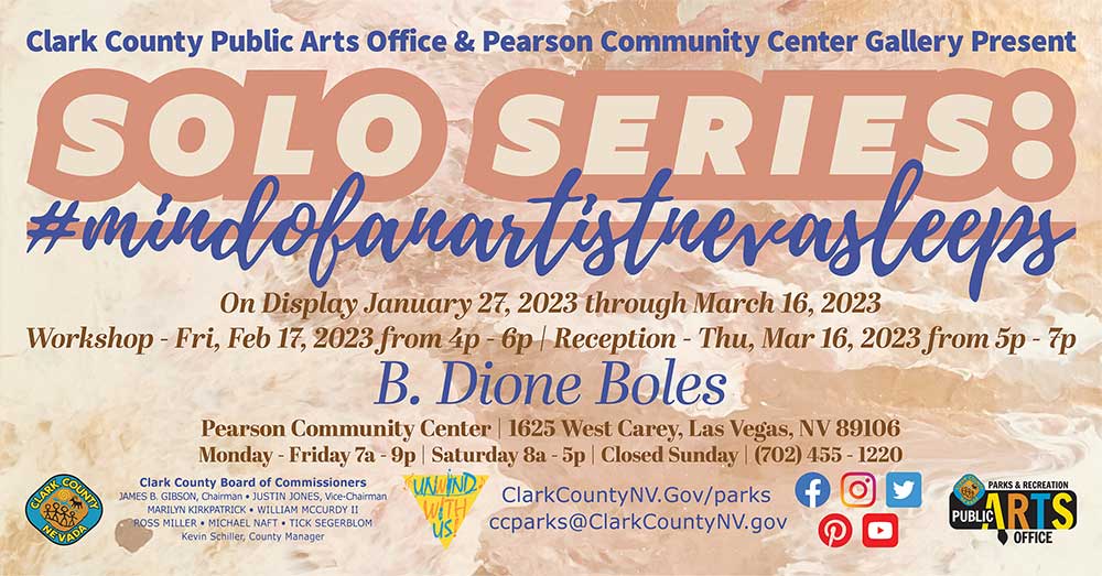 The SOLO SERIES Juried Exhibition open call provides four local, emerging, and under-recognized artists who currently live, formerly lived, and/or have a connection to the Historic Westside community in Las Vegas. Each of the four selected artists has the opportunity to present an exhibition at the Pearson Gallery for at least 7 weeks between September 2022 to May 2023. In addition, each artist is required to teach a workshop in relation to their exhibit. Each artist was selected by a blind jury, which consists of members who also have a connection to the Historic Westside community.