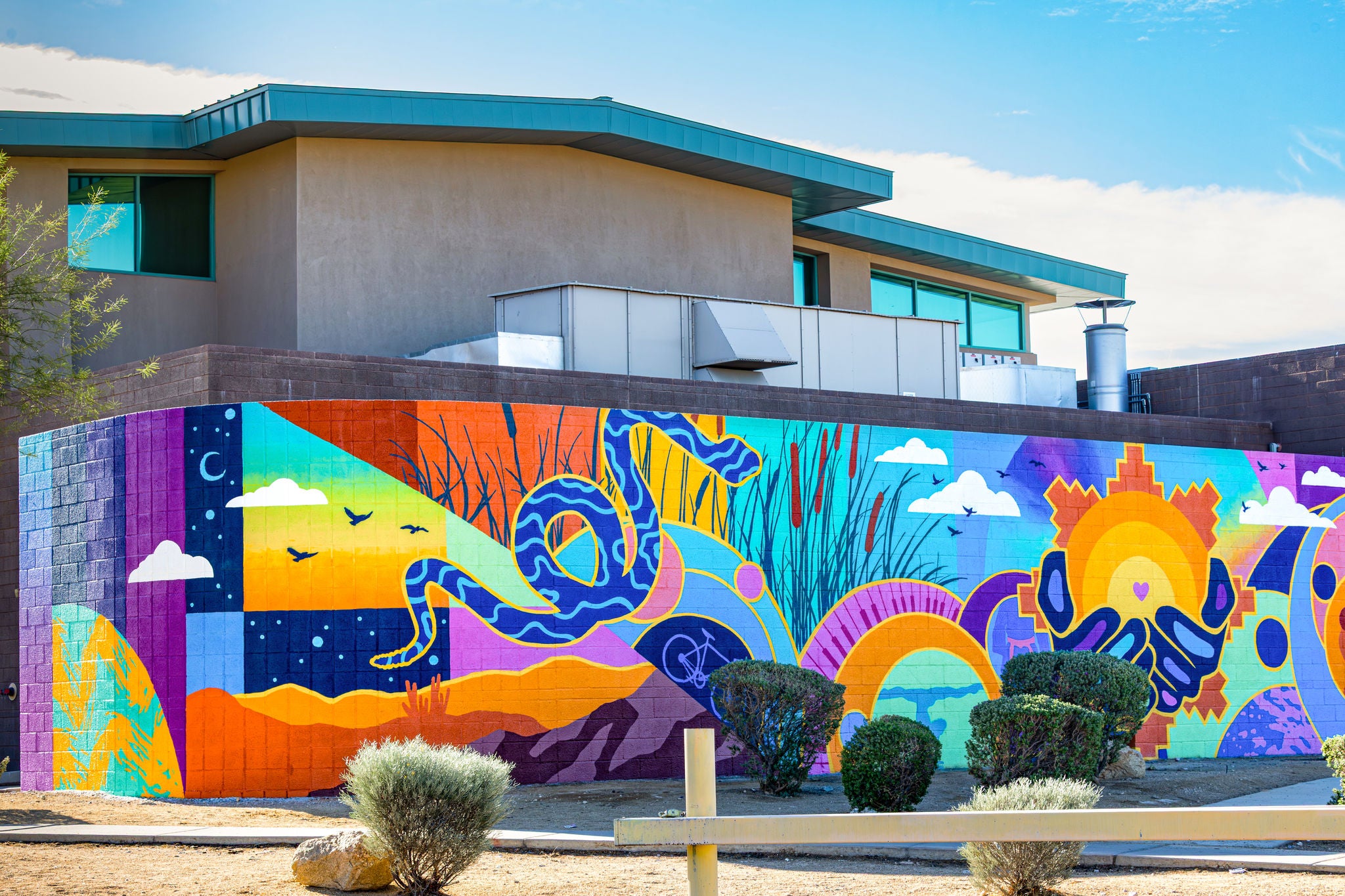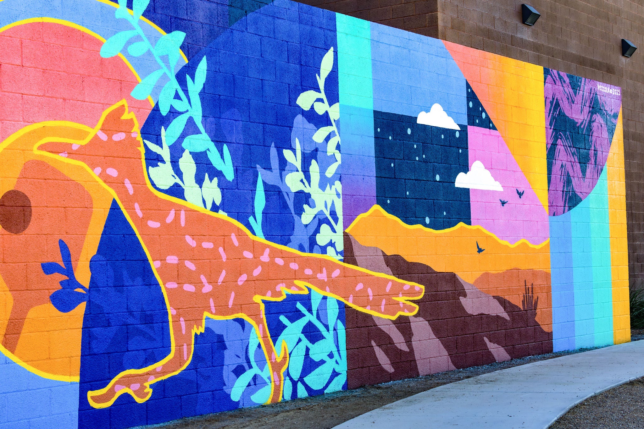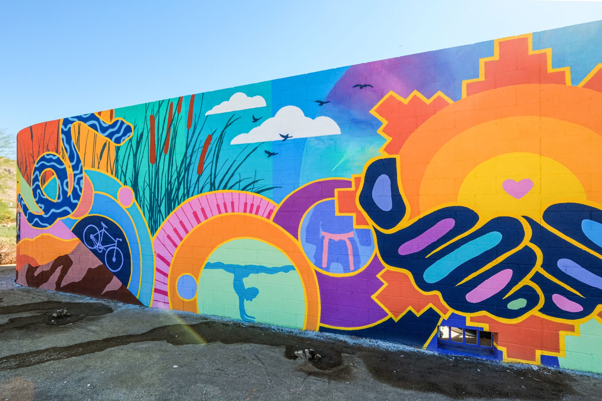 Bathed in color and motion, Radiance Rising celebrates the natural beauty, cultural richness, and daily rhythms that define the community it calls home. Created by artist Eric Vozzola, the mural transforms the pulse of local life into a symphony of form and light, an artwork that sings as much as it shines.