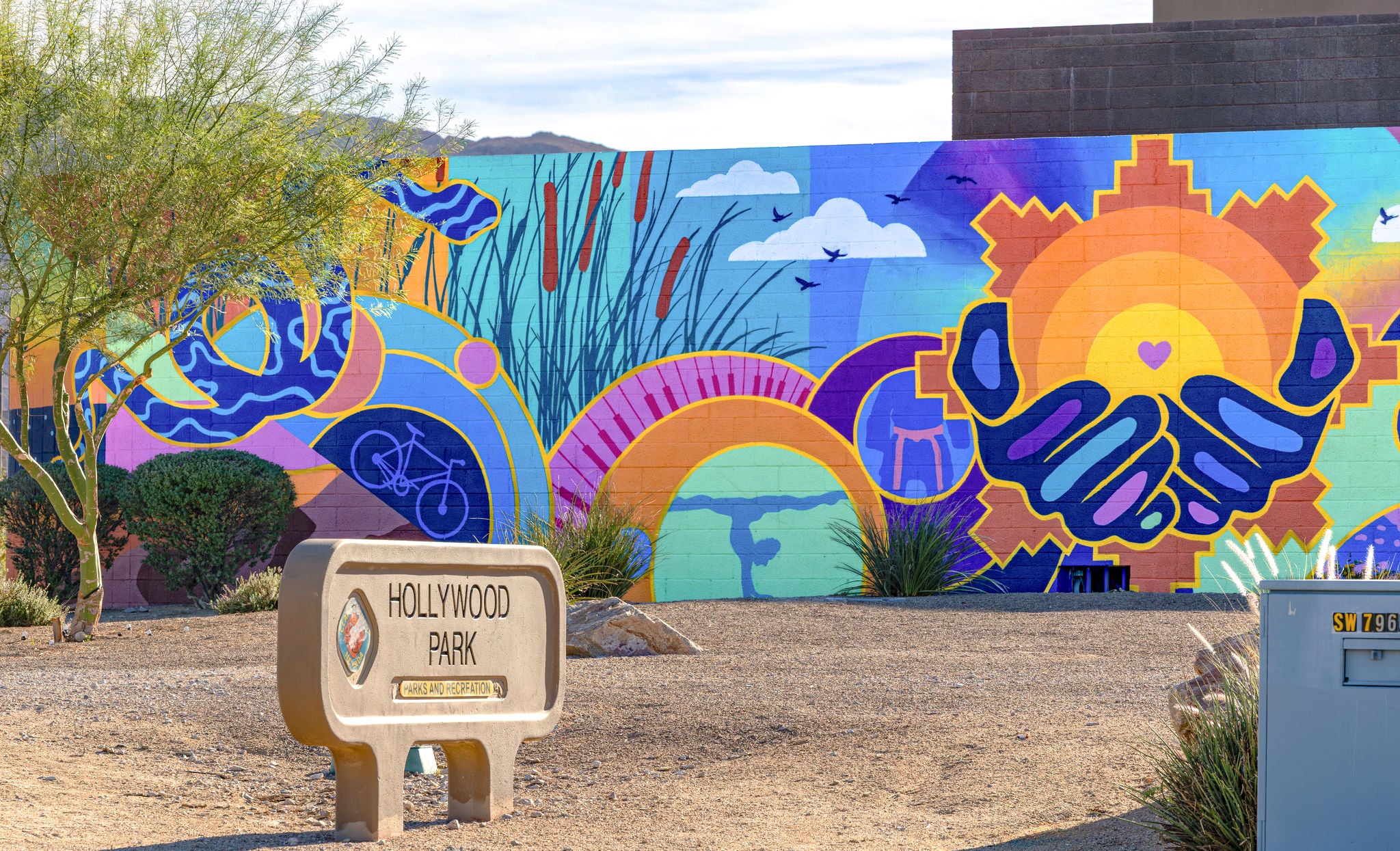 The mural depicts a dynamic roadrunner as an emblem of vitality, movement, and the forward spirit of the community. Beneath a radiant sun, interlocking hands convey unity, compassion, and shared purpose, grounding the work in human connection. Around these figures, circular motifs ripple outward like echoes of sound, their rhythm reflecting the melodies of “We Love This City.” Each curve and burst of color mirrors the harmony and diversity of local life, distinct stories, cultures, and paths intertwined within a single, vibrant whole. At the mural’s core, the Hollywood Recreations Center emerges as the heart of this energy, the gathering place where art, music, and community converge in radiant motion.