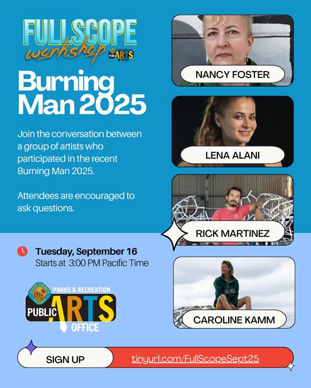Full Scope Workshop for September invited artists Caroline Kamm and Rick Martinez, Lena Alani, and Nancy Foster. These artists recently participated in Burning Man 2025. They shared their experiences on how they found out about Burning Man, how they applied to participate, their fabrication process, and about the event itself. Join in the conversation between first time burner, returning burner, and experienced burners to learn more about the event.