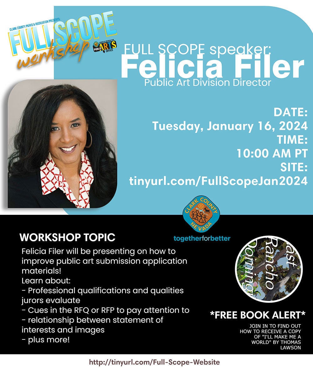 Full Scope Workshop for January was presented by Felicia Filer, Public Art Division Director for Los Angeles, California’s Department of Cultural Affairs. Felicia Filer discussed the professional qualifications and qualities the artist selection panel is evaluating, the cues in the RFQ or RFP that you should pay attention to, and the relationship between your written statement of interest and your images, and more!