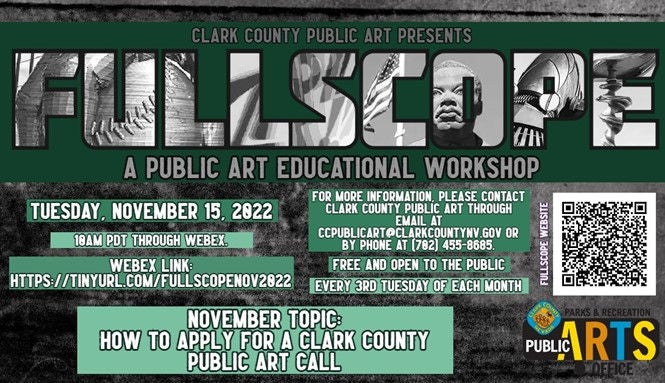 Full Scope Workshop for the month of November will be a presentation about the process of Public Art Call submissions. The workshop will break down how to read an art call, how to prepare the documents needed for the call, and what to expect after submitting for a Clark County Public Art call.