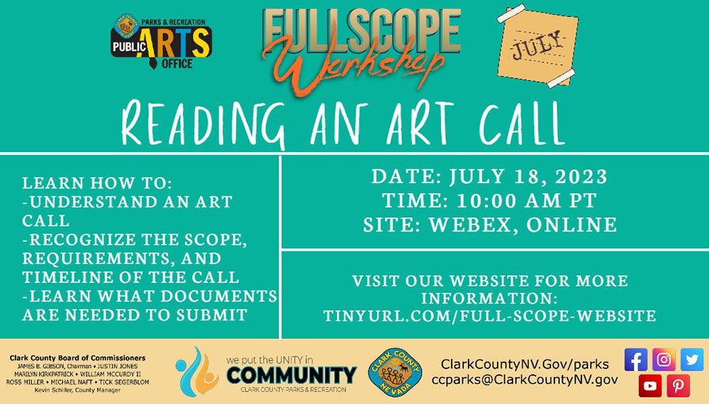 Full Scope Workshop for July will break down how to read Clark County Public Art Calls. In this workshop, attendees will learn how to understand an art call, and recognize the scope, requirements, and timeline of the call. Attendees will also learn what documents are needed to submit for these calls. The art call that will be covered is for the current ZAP project. Attendees will have the opportunity to ask questions about Clark County art calls and other public art questions. This workshop will not be recorded.