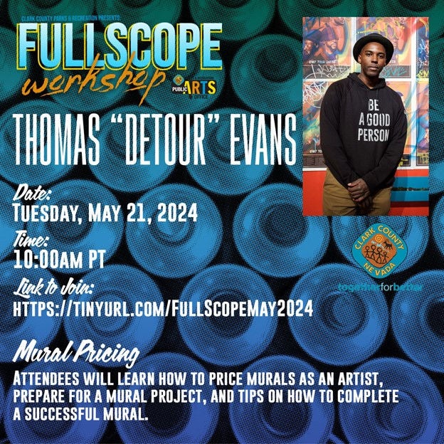 Full Scope Workshop for May was a presentation by Thomas “Detour” Evans., Public Art Creative from Denver, Colorado. Detour covered topics about mural pricing, how to prepare for a mural project, tips on how to successfully complete a mural as a public artist, and much more.