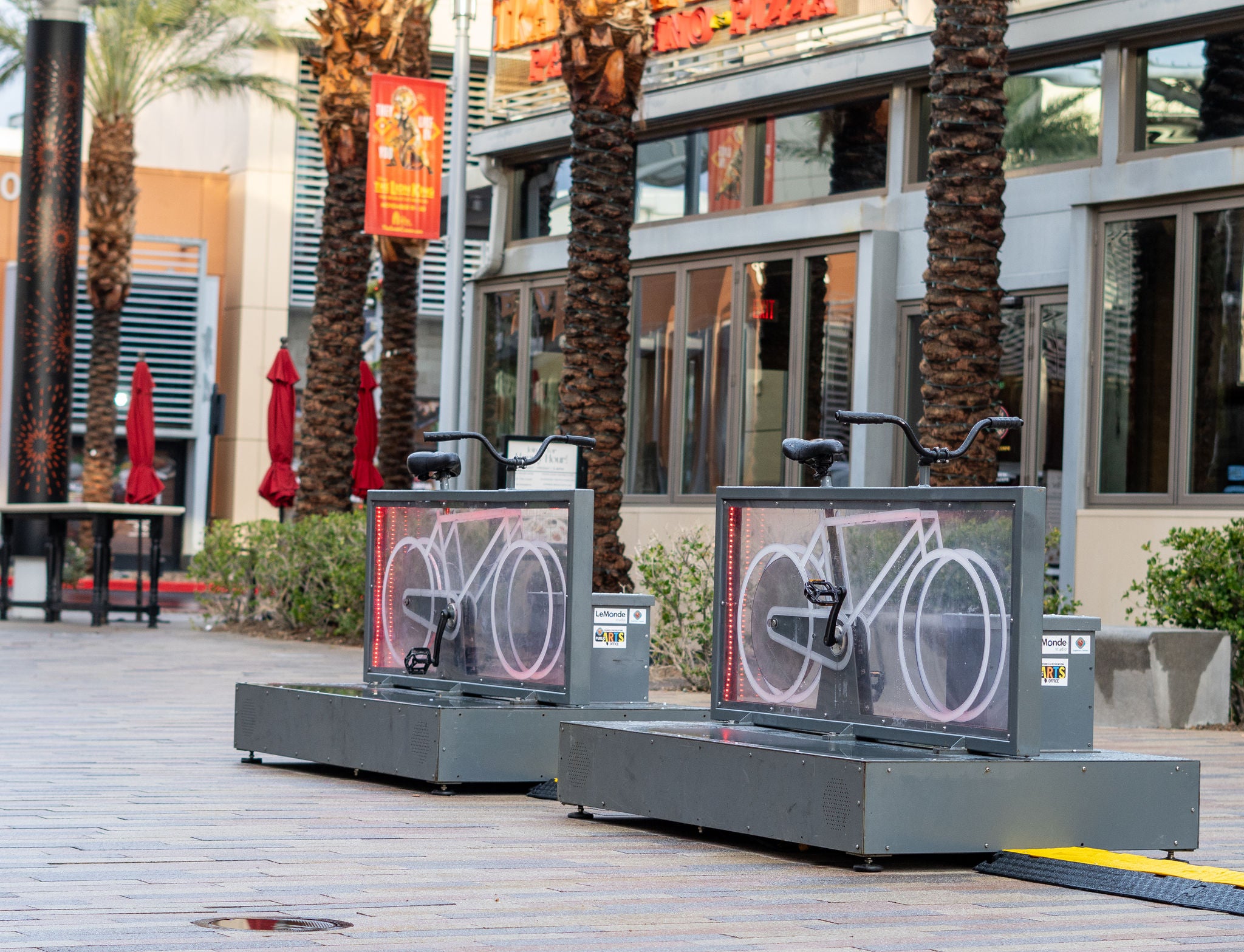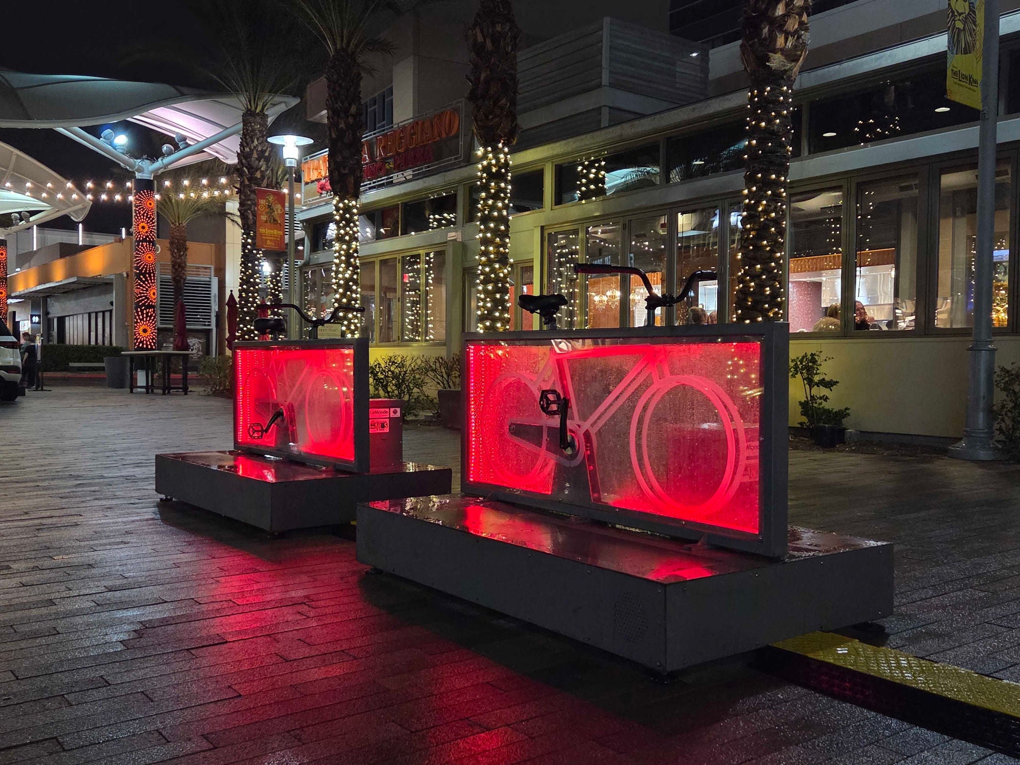 Come to Downtown Summerlin to experience Light Lane. Located under the pavilion and promenade, this fun activation features two futuristic stationary bicycles that light up the ground beside it with a projection when pedaling. The projection of this installation was designed by a local artist, Recycled Propaganda. Working with Clark County Commissioner Justin Jones, Light Lane’s intention is to promote bike safety while also demonstrating eco-friendly public art. Stop by Downtown Summerlin from November 15, 2025, through January 1, 2026. for a chance to see this interactive exhibit in action!