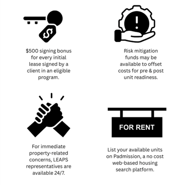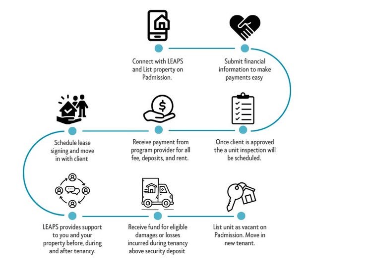 As a landlord, you have the opportunity to help reduce homelessness in our community while benefiting from lower vacancy rates, consistent rent payments, and tenant support. In collaboration with our nonprofit partners the LEAPS team works with landlords like you to provide affordable, supportive, and stable housing to the most vulnerable members of our community.