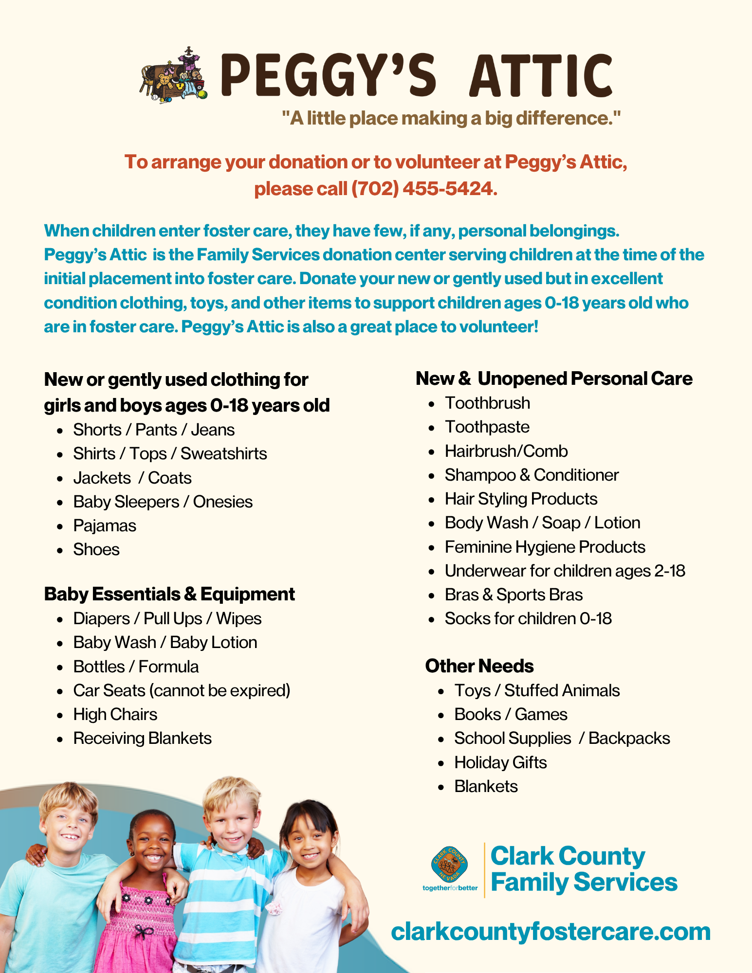 Peggy's Attic is a compassionate community-driven donation center dedicated to supporting Clark County's most vulnerable children. Serving babies, children, and teenagers entering foster care through Clark County Family Services, Peggy's Attic provides essential care packages when children are placed into protective custody with few or no personal belongings.