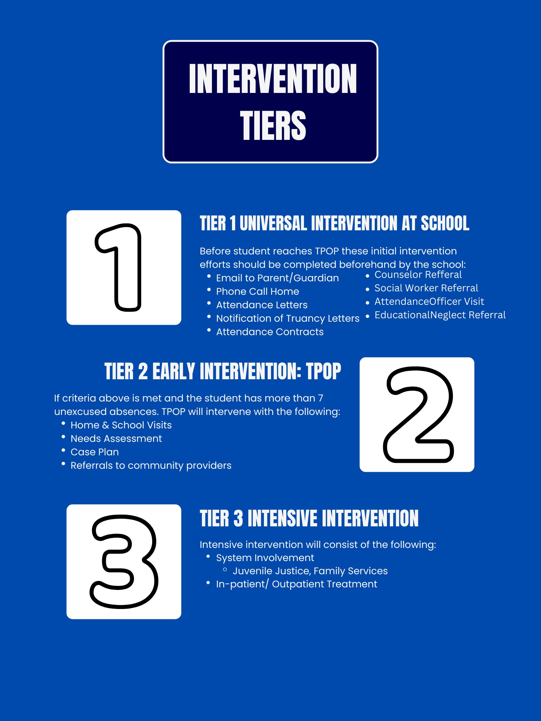 The Truancy Prevention Outreach Program (TPOP) is a tier 2 program that supports students with 7 or more unexcused absences. By working with students, families, and community partners, TPOP identifies challenges causing chronic absenteeism, provides resources, and addresses barriers to regular school attendance. The goal is to prevent absences from accumulating and help students stay on track socially and academically.